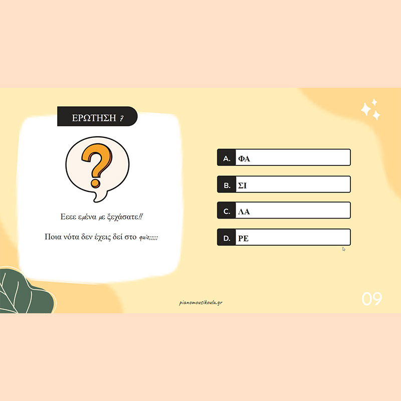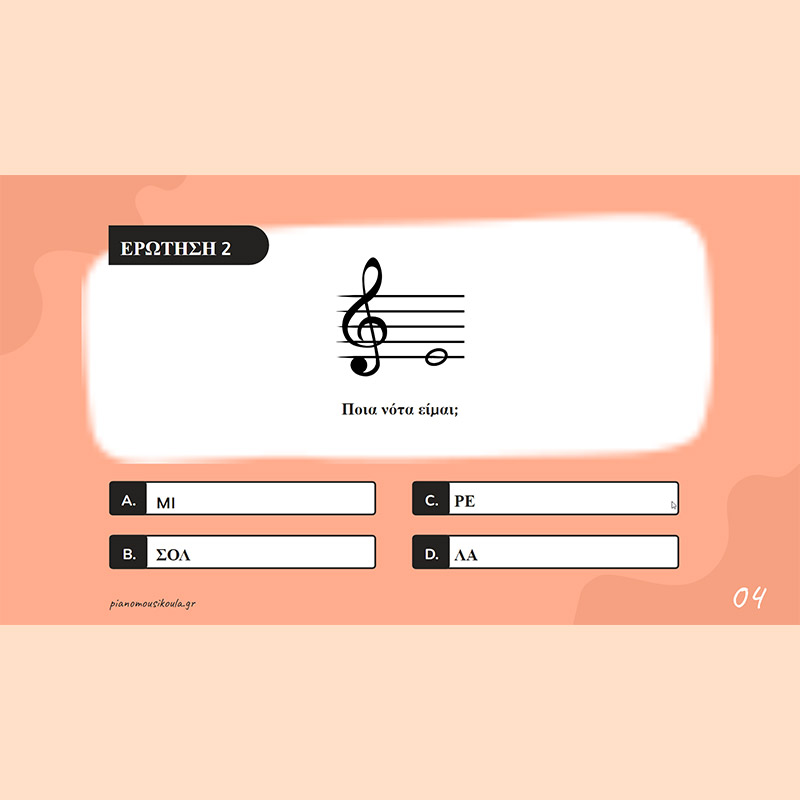 Ο σκοπός του quiz είναι να βοηθήσει τους μαθητές να επαναλάβουν και να εμπεδώσουν τις γνώσεις που απέκτησαν κατά τη διάρκεια του μαθήματος. Μέσω διαδραστικών ερωτήσεων, οι μαθητές εξασκούν την αναγνώριση κατανόηση νοτών, βελτιώνοντας την θεωρητική γνώση και την ανάγνωση παρτιτούρας. Το quiz λειτουργεί ως μέσο ανατροφοδότησης, επιτρέποντάς τους να εντοπίσουν τυχόν αδυναμίες και να βελτιώσουν τις επιδόσεις τους, ενώ ενθαρρύνει τη συμμετοχή και την ενεργή μάθηση σε ένα πιο διασκεδαστικό περιβάλλον.